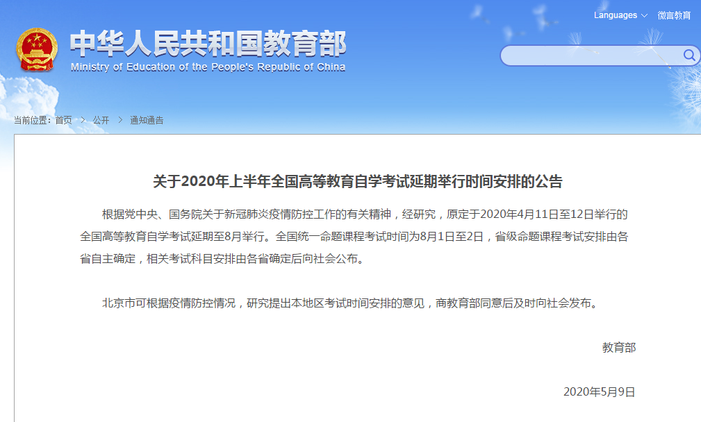 根據黨中央、國務院關于新冠肺炎疫情防控工作的有關精神,經研究,原定于2020年4月11日至12日舉行的全國高等教育自學考試延期至8月舉行。全國統一命題課程考試時間為8月1日至2日,省級命題課程考試安排由各省自主確定,相關考試科目安排由各省確定后向社會公布。